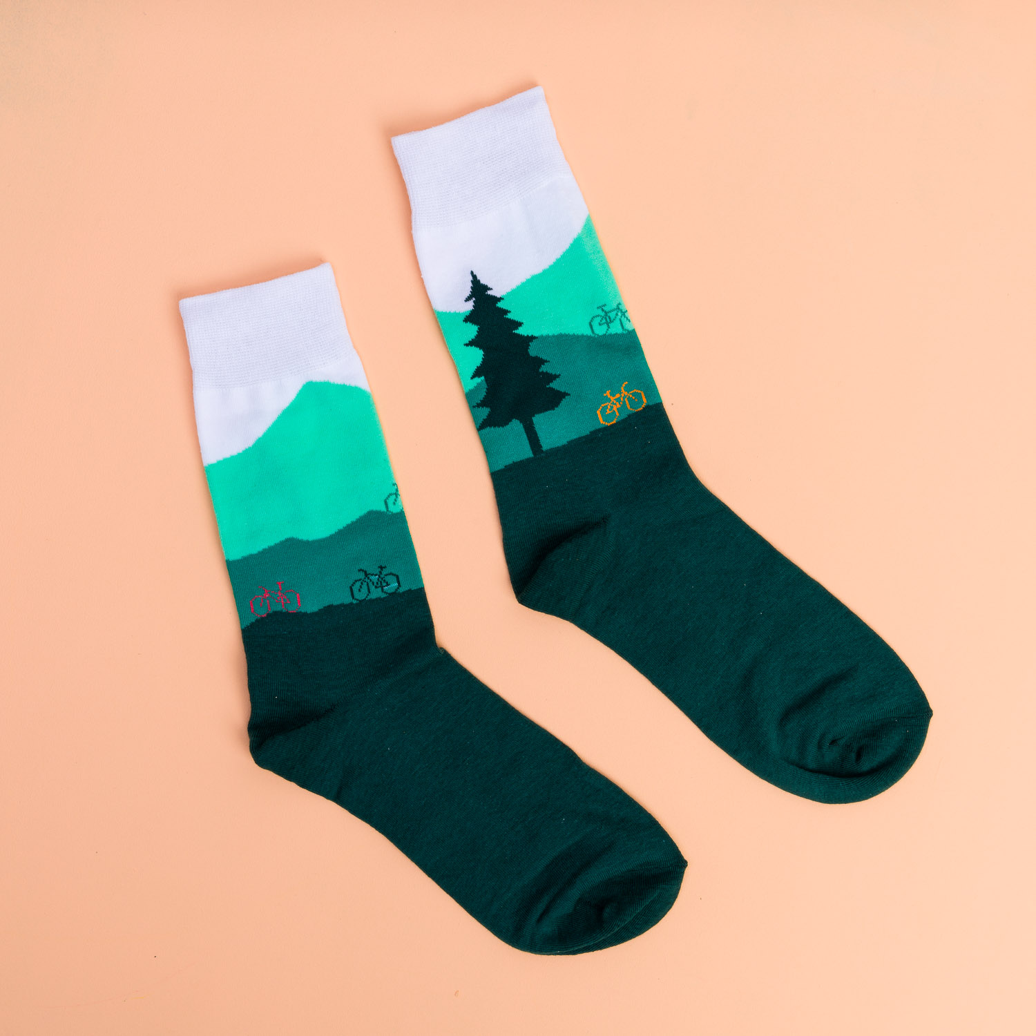 Fietssokken van Winkee. Eén paar sokken met de afbeelding van bergen, dennenbomen en fietsen in de bergen. Een origineel cadeautje voor mensen die van fietsen houden. De Bike Socks van Winkee zijn gemaakt van katoen en elastan. Geschikt voor maat 36-40. Afmeting verpakking: 15 x 4 x 10 centimeter.