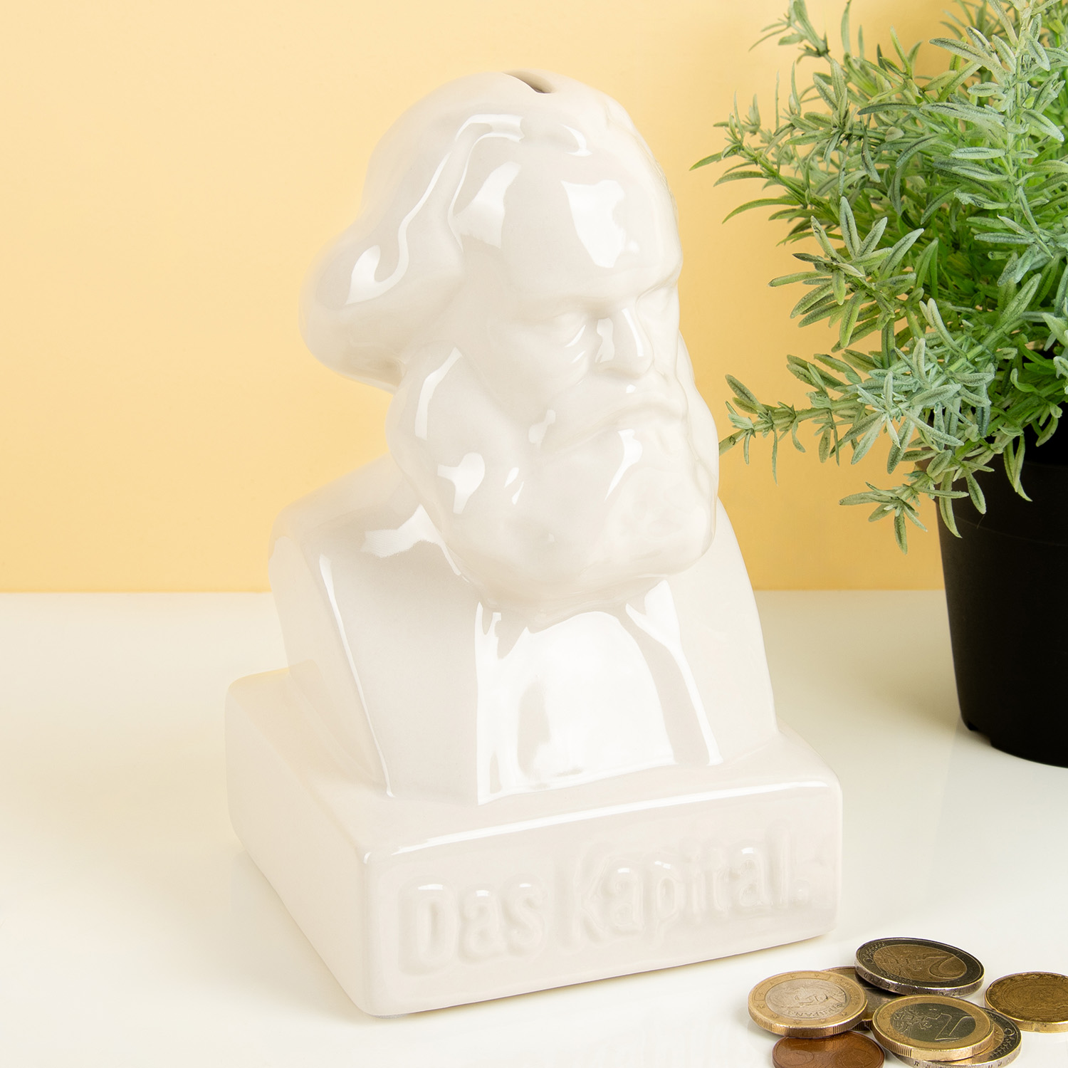 Spaarpot van Kikkerland in de vorm van Karl Marx Das Kapital. Wees slim en stop je geld in deze spaarpot. Gemaakt van keramiek en ziet eruit als een standbeeld. Originele spaarpot. Met rubberen beschermdopjes aan de onderkant. Afmeting: 18 x 10 x 10 centimeter.