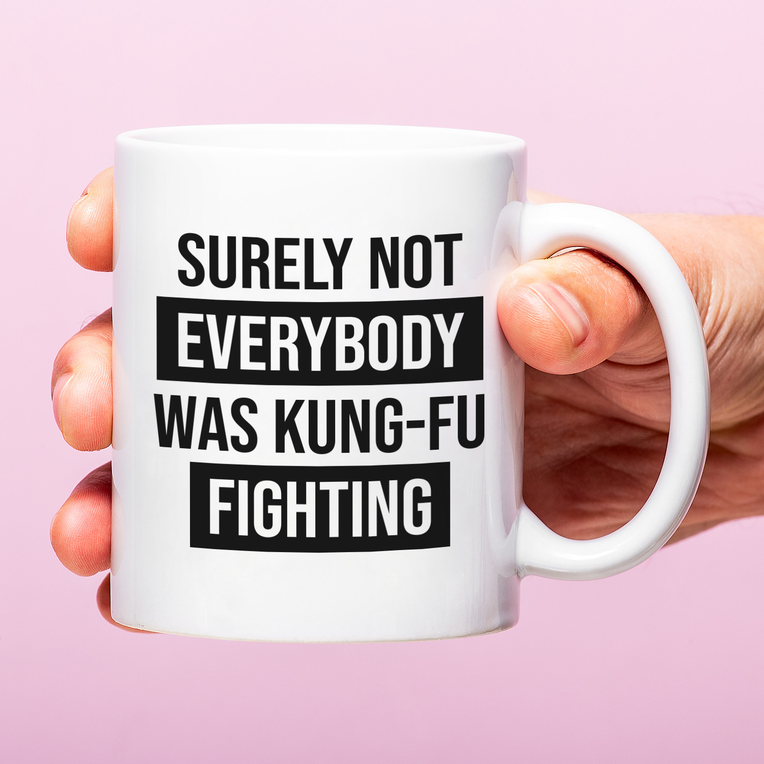 Met de tekst “Surely not everybody was kung-fu fighting” is deze mok een knipoog naar de nostalgische hit van Carl Douglas – en de vraag die ons altijd heeft beziggehouden: was iedereen echt bezig met kung-fu vechten? En wat betekent dat eigenlijk voor ons dagelijks leven? Hoeveel van ons zouden echt kunnen vechten als het nodig was? Spoiler alert: waarschijnlijk niet zoveel.