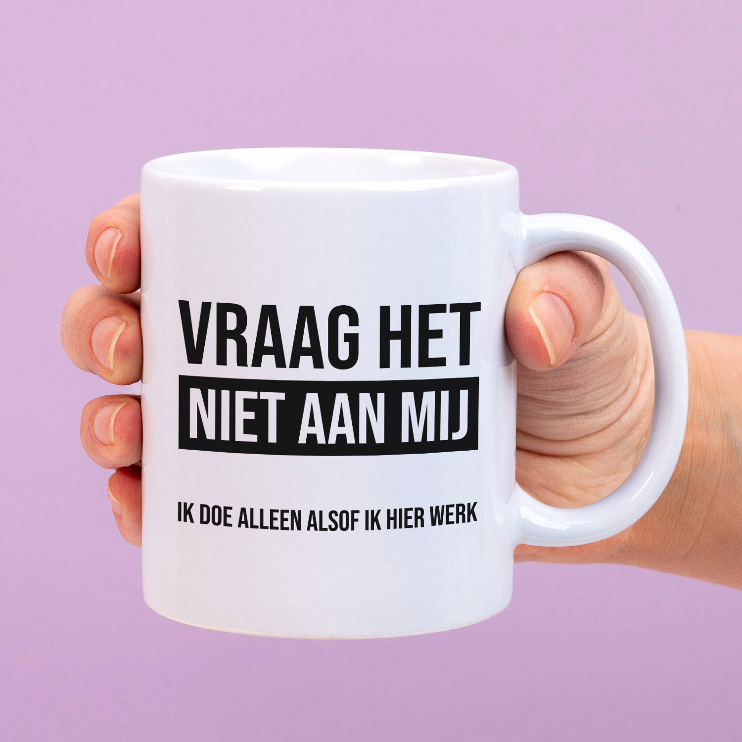 De Mok Vraag het niet aan mij is hét cadeau voor collega’s met een gezonde dosis sarcasme. Een koffiemok die meteen duidelijk maakt hoe jij je werkdag doorkomt.