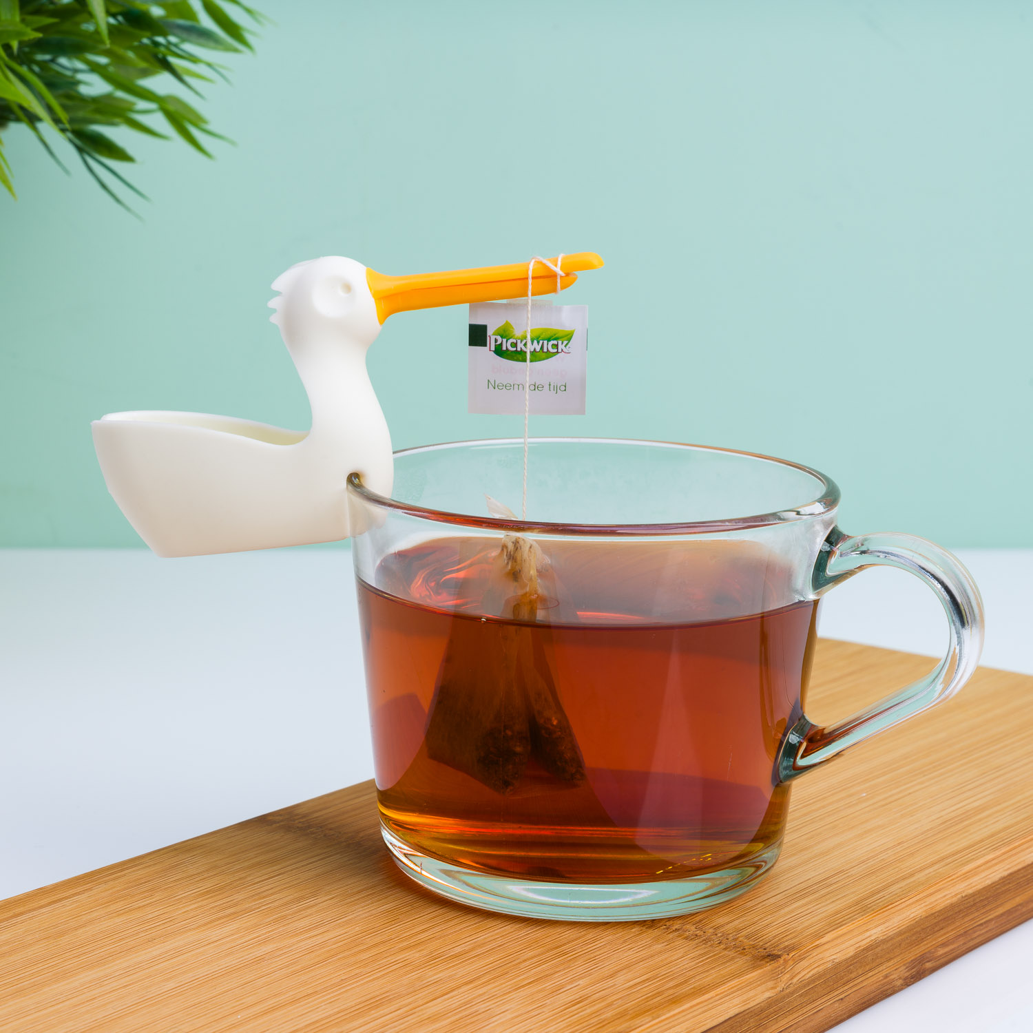 Pelicup theezakjeshouder van Peleg Design. Een pelikaan die je theezakje vasthoudt met zijn snavel en waar je je natte theezakje in kan zetten. Een handig en grappig accessoire voor mensen die graag thee drinken zonder te smeren. Je zet hem eenvoudig op de rand van je theeglas. Afmeting: 5,8 x 11 x 3,2 centimeter.