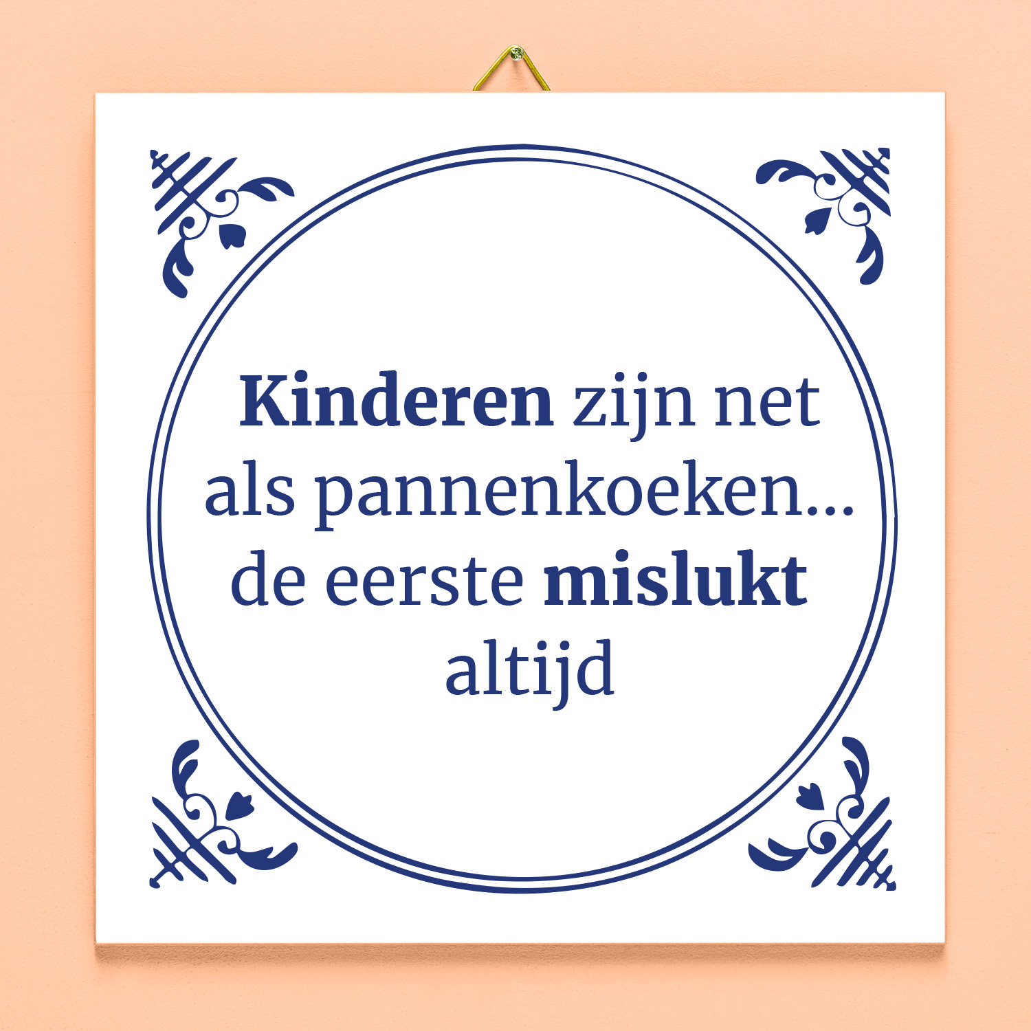 Verras je oudere broer of zus met het Tegeltje Kinderen zijn net als pannenkoeken… de eerste mislukt altijd. Een grappig spreuktegeltje voor de oudste van het gezin.