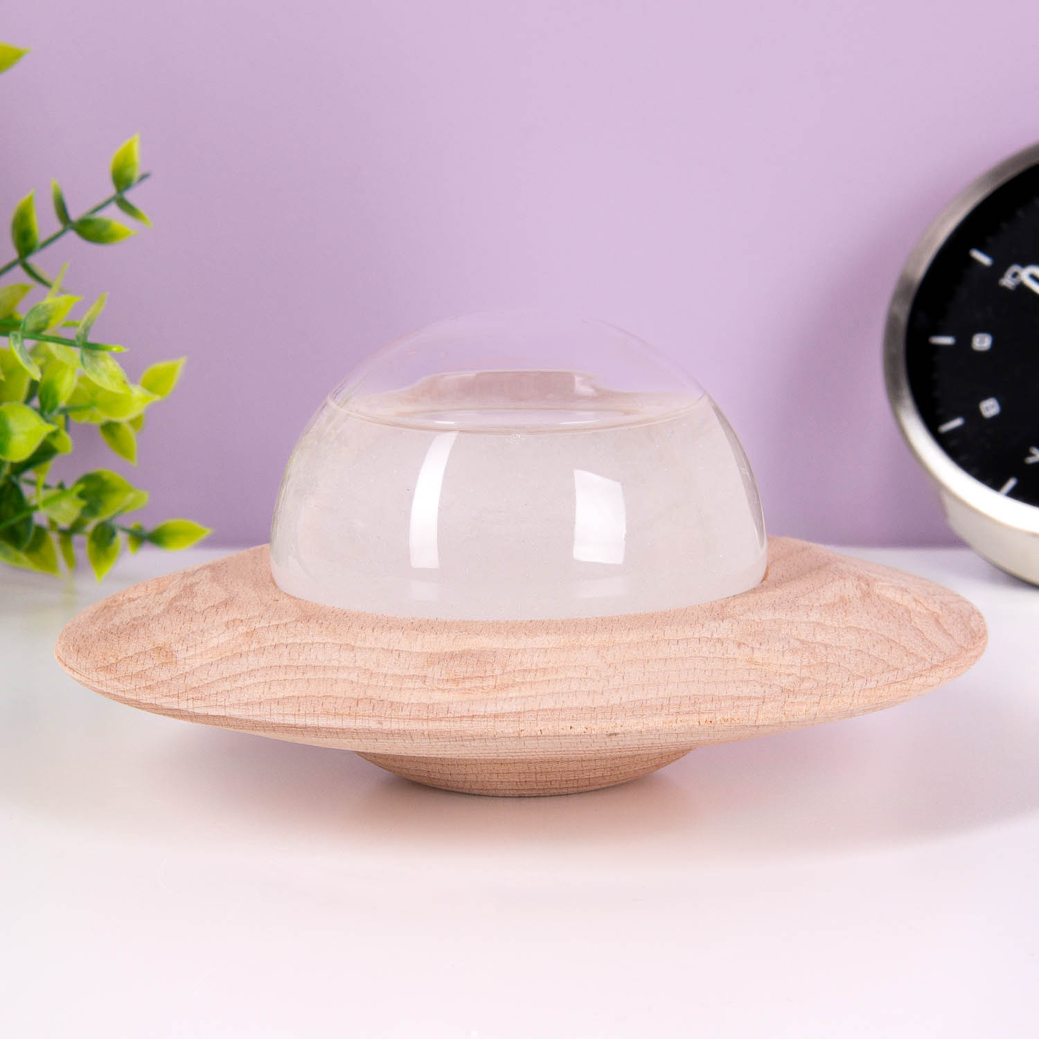 Het UFO stormglas van Bitten is een donderglas of stormglas in de vorm van een vliegende schotel die het weer voorspelt. De vloeistof in het glas weet wat voor weer het wordt. Geeft bijvoorbeeld aan of het zonnig of bewolkt gaat worden. Op een houten standaard. Geef het stormglas een mooi plekje in de woonkamer.