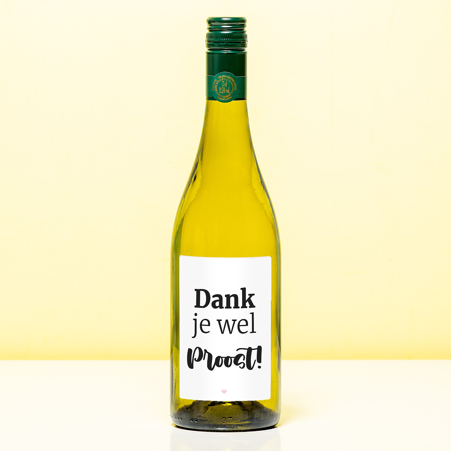 Wijnfles Dank je wel proost (Sauvignon Blanc). Fles witte wijn met de tekst Dank je wel. Proost! De Sauvignon Blanc komt uit de Franse regio Pays d'Oc en heeft een helder geelgroene kleur met een intense neus van citrus, zacht tropisch fruit en gemaaid gras. Bevat een toets ananas, Granny Smith appel en meloen. Inhoud: 750 milliliter.