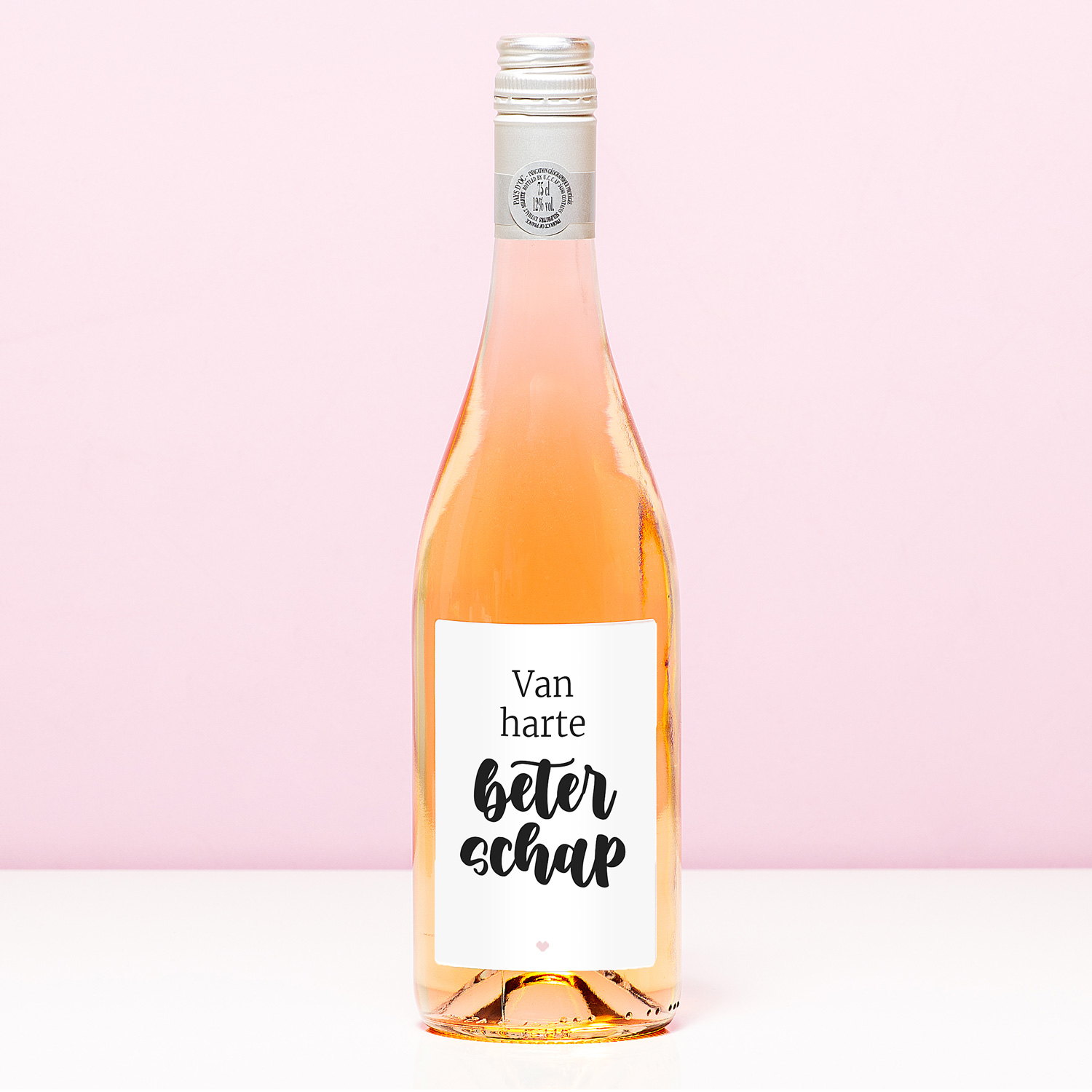 Wijnfles Van harte beterschap (Blush Rosé). Fles blozende rosé wijn met de tekst Van harte beterschap. De Blush Rosé komt uit de Franse regio Pays d'Oc en heeft een bleek zalmroze kleur, geurend naar frambozen en aardbeien. Het is een elegante, zachte droge, Mediterrane terras rosé. Inhoud: 750 milliliter.